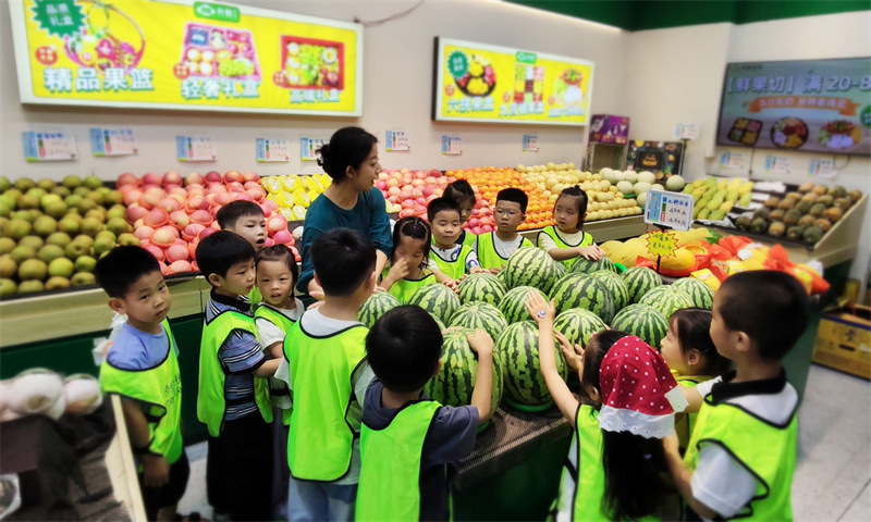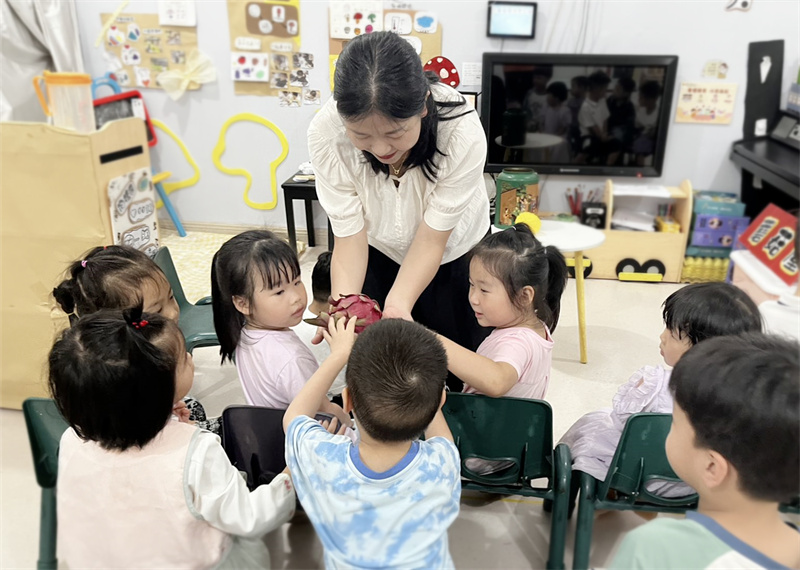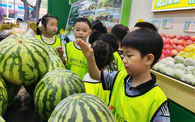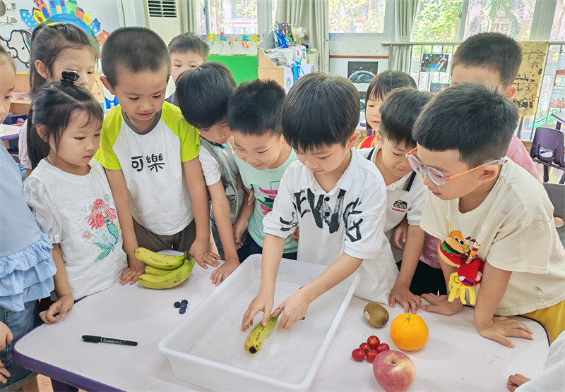 “老师,西瓜切开为什么有星星?”孩子们用塑料刀切开猕猴桃(横切面的太阳纹)、火龙果(芝麻点阵密码)、杨桃(立体五角星)……发现水果里藏着几何奥秘。