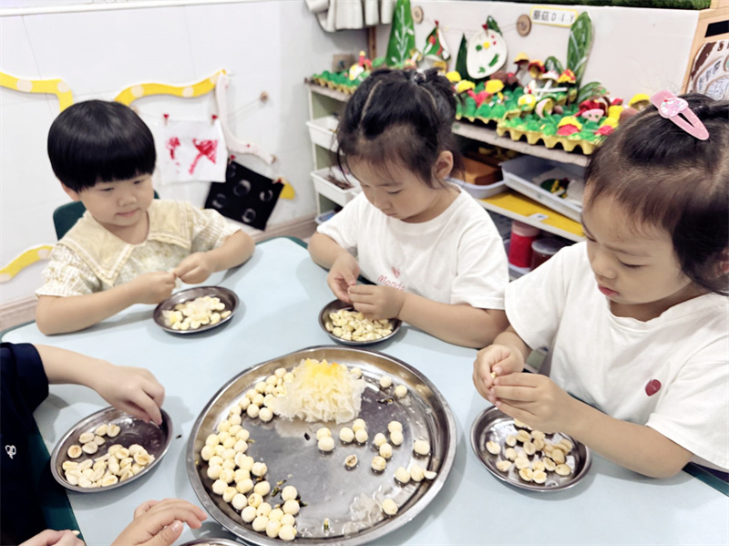灵活的小手剥掉莲子的外衣,取出莲心,搭配泡发的银耳,一起放入锅中蒸煮。