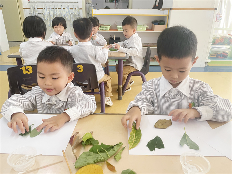 将收集的落叶细心拼贴成画。