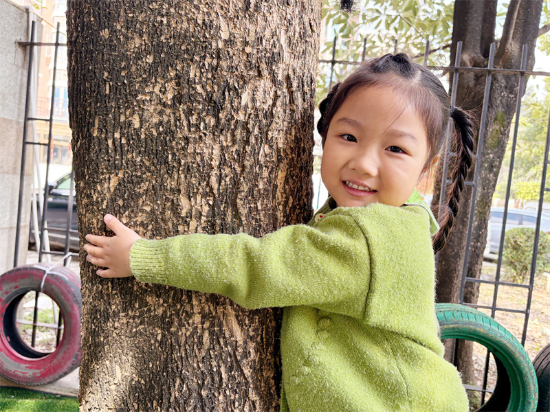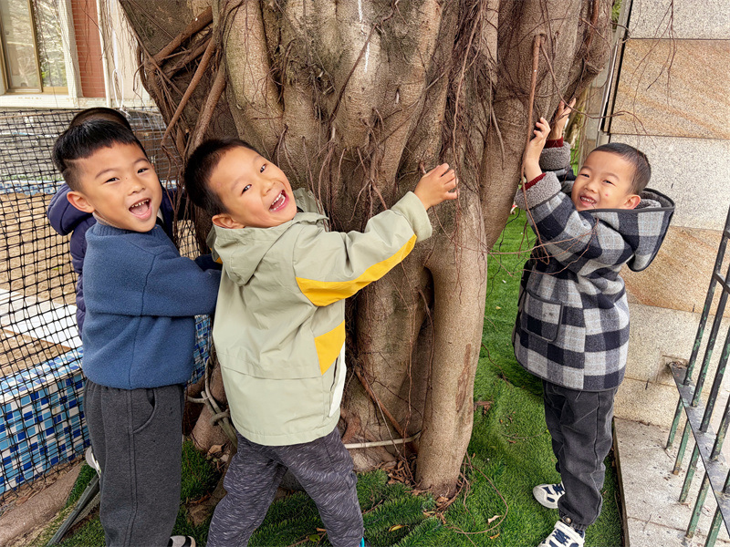 孩子们张开双臂,环抱树干,