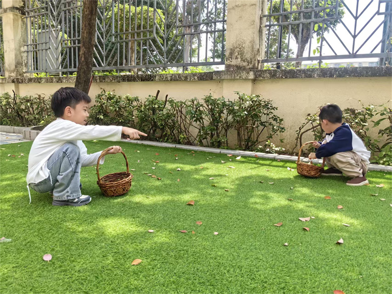 将形态各异的落叶、落花收入篮中。
