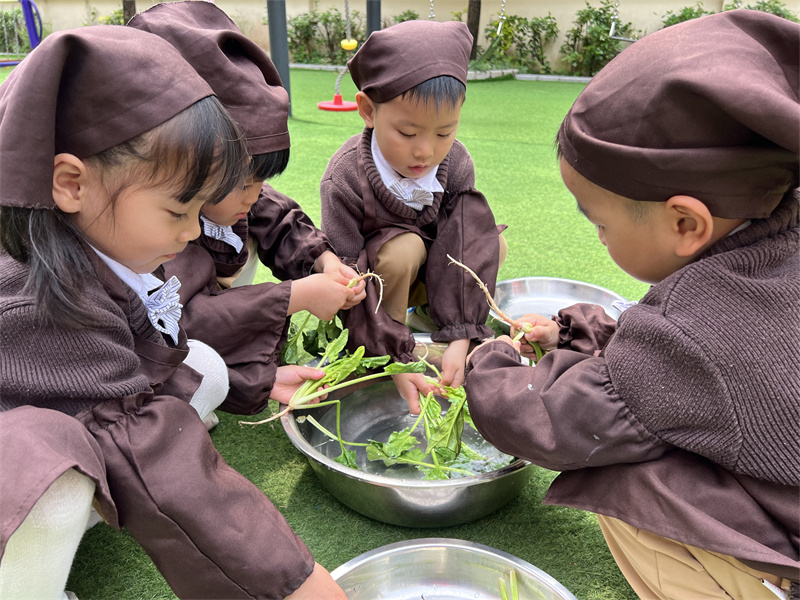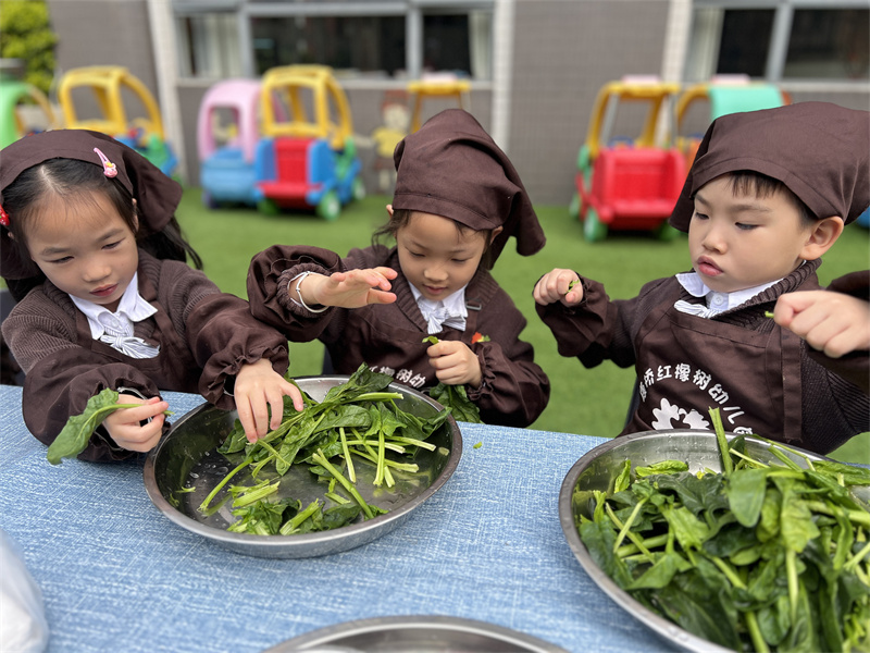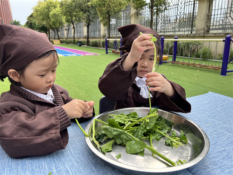 孩子们细心地挑选菠菜、